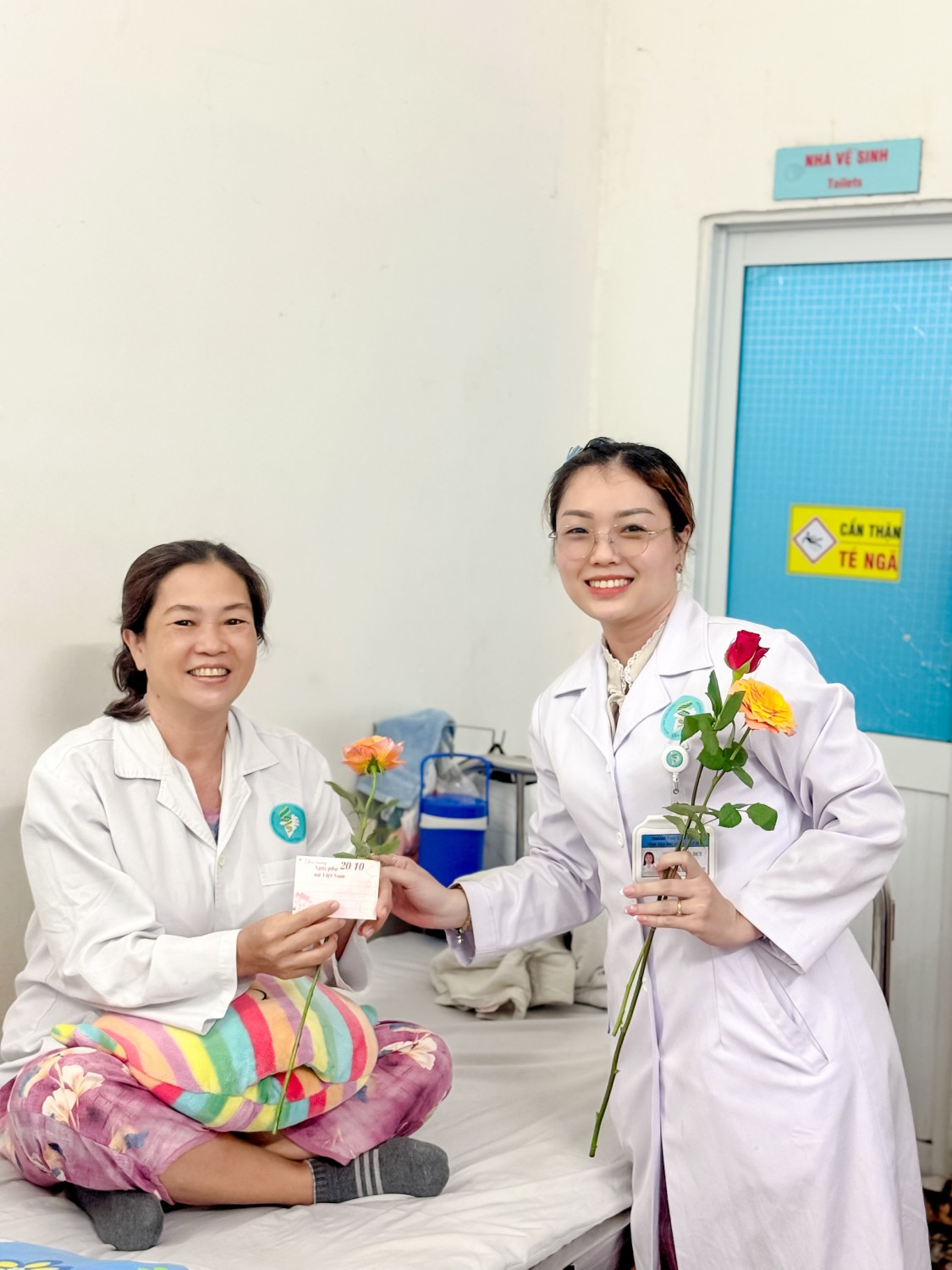 Ngay từ sáng sớm, từng nhánh hoa hồng tươi thắm được chuẩn bị chỉn chu, cùng những tấm thiệp nhỏ xinh với lời chúc chân thành nhưng đầy cảm xúc. Các nhân viên phòng Công tác xã hội, nhà hảo tâm, sinh viên tình nguyện đã cùng nhau mang hoa, mang lời chúc đến từng giường bệnh. Tại đây, nhiều bệnh nhân không giấu nổi niềm vui. Có những nụ cười rạng rỡ, có những ánh mắt rưng rưng, tất cả hòa vào nhau, tạo nên bức tranh thật đẹp về tình người nơi bệnh viện.