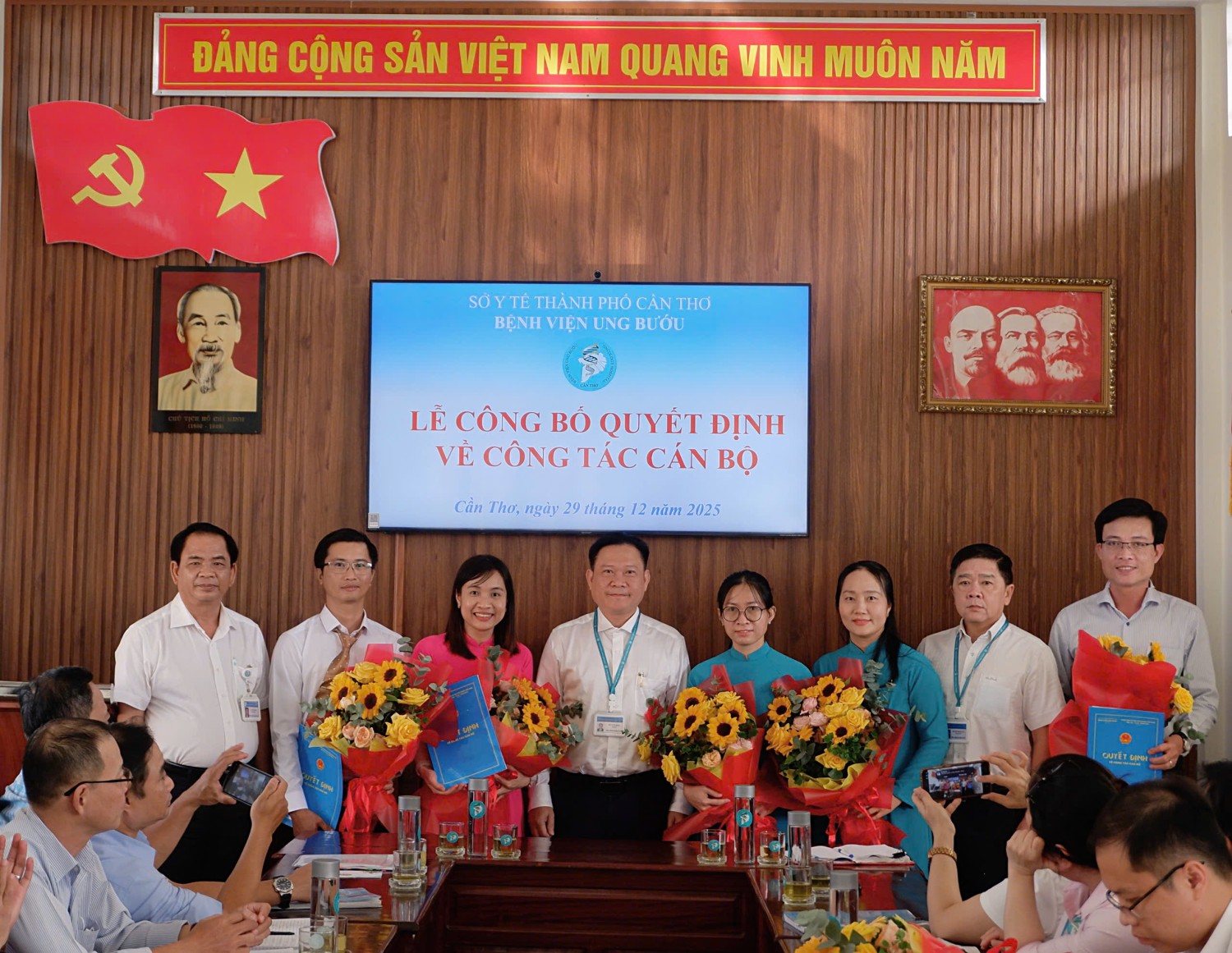 Chiều ngày 29 tháng 12 năm 2025, Bệnh viện Ung bướu thành phố Cần Thơ đã tổ chức Lễ công bố trao Quyết định về công tác cán bộ Bệnh viện trong Bệnh viện. Tham gia buổi Lễ trao Quyết định bổ nhiệm có TSBS. Võ Văn Kha - Bí thư Đảng ủy - Giám đốc Bệnh viện, BSCKII. Huỳnh Thảo Luật - Phó Giám đốc, BSCKII. Lê Tiến Mãnh - Phó Giám đốc Bệnh viện, TS.BS Hồ Long Hiển - Phó Giám đốc Bệnh viện cùng các trưởng, phó khoa, phòng trong Bệnh viện.