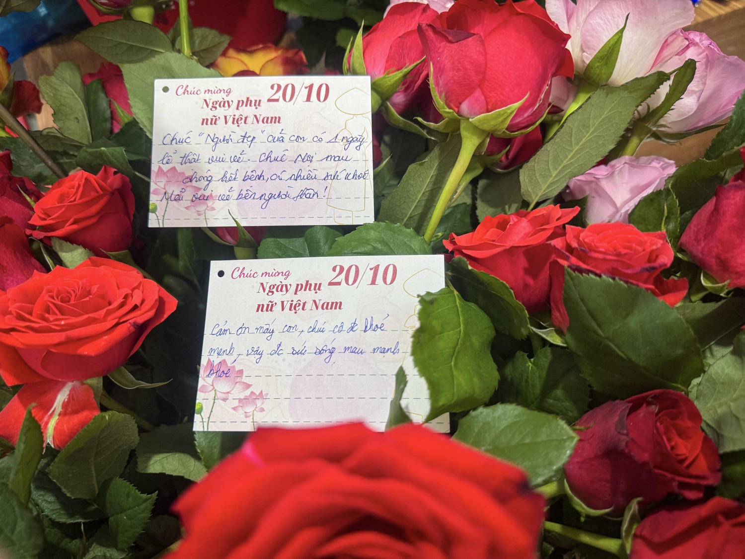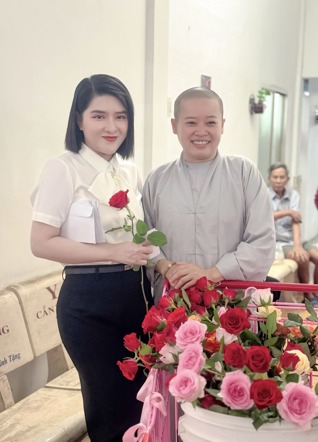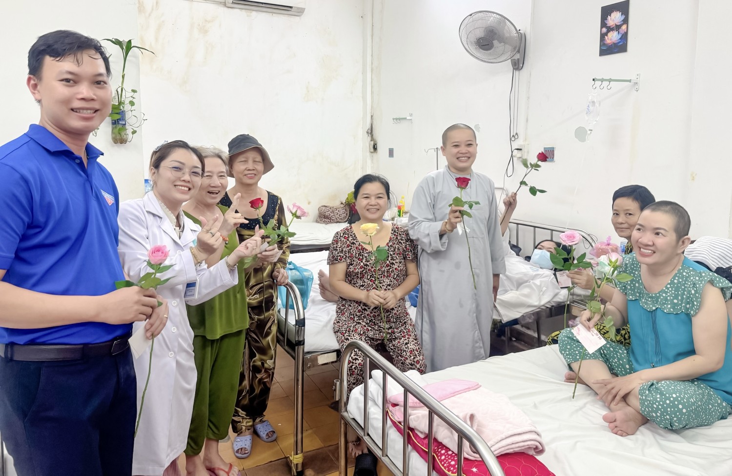 Ngay từ sáng sớm, từng nhánh hoa hồng tươi thắm được chuẩn bị chỉn chu, cùng những tấm thiệp nhỏ xinh với lời chúc chân thành nhưng đầy cảm xúc. Các nhân viên phòng Công tác xã hội, nhà hảo tâm, sinh viên tình nguyện đã cùng nhau mang hoa, mang lời chúc đến từng giường bệnh. Tại đây, nhiều bệnh nhân không giấu nổi niềm vui. Có những nụ cười rạng rỡ, có những ánh mắt rưng rưng, tất cả hòa vào nhau, tạo nên bức tranh thật đẹp về tình người nơi bệnh viện.