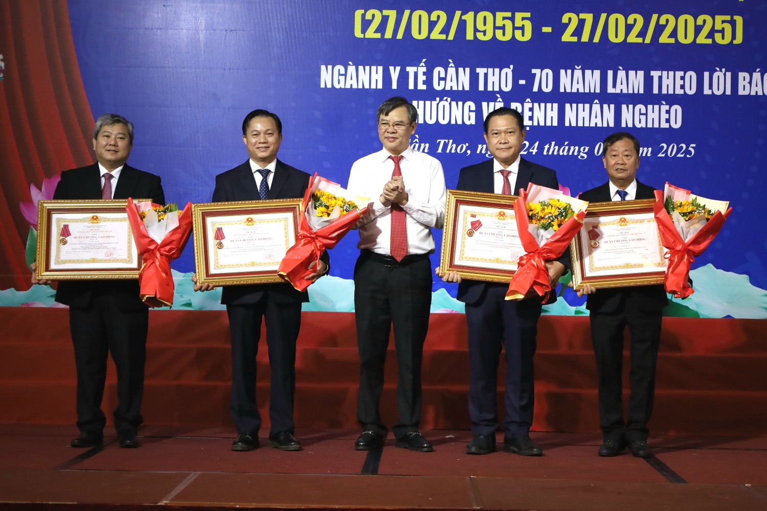 Thầy thuốc Ưu tú - TSBS. Võ Văn Kha - Giám đốc Bệnh viện Ung bướu thành phố Cần Thơ (Thứ 2 bên phải) vinh dự nhận Huân chương Lao động hạng Ba