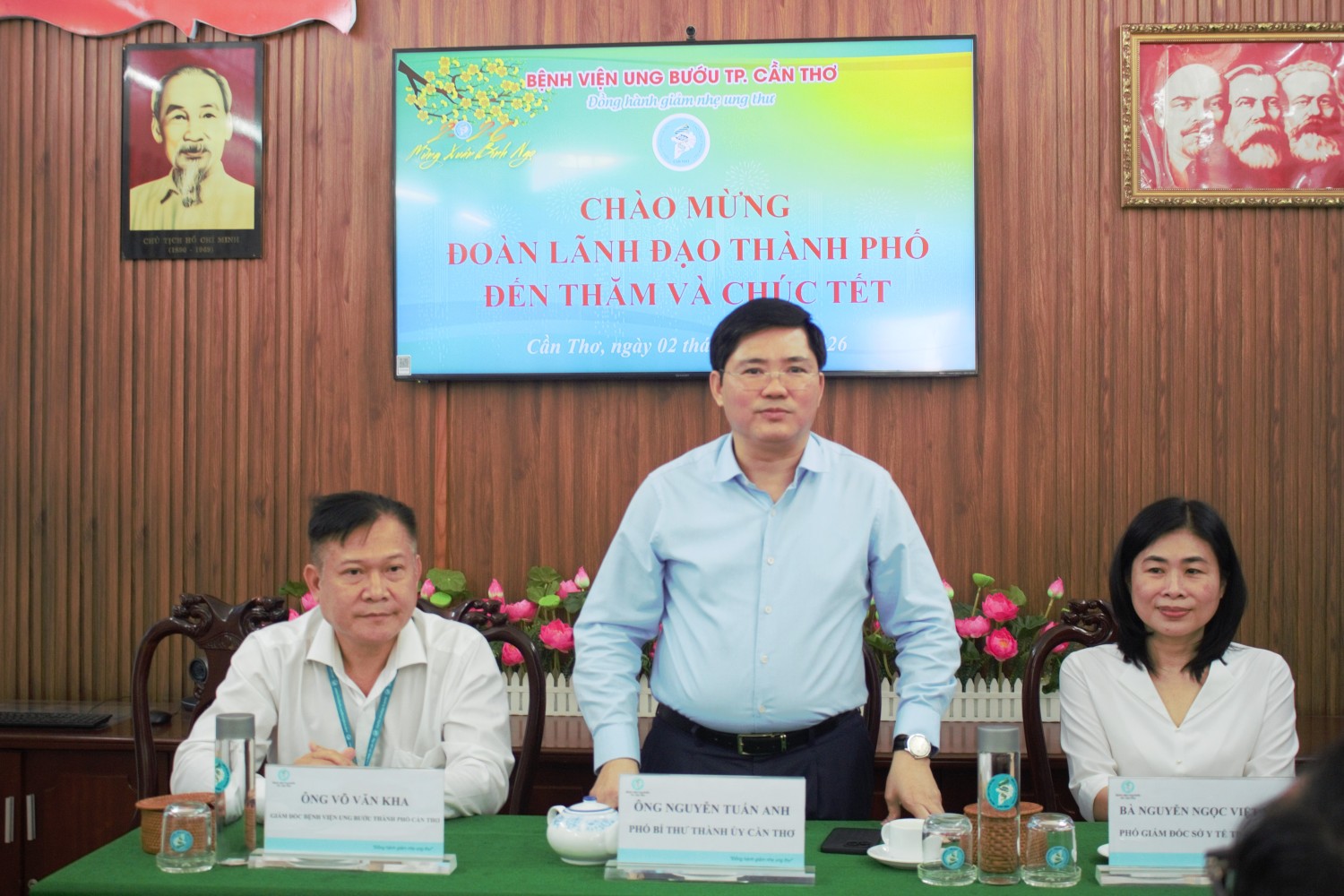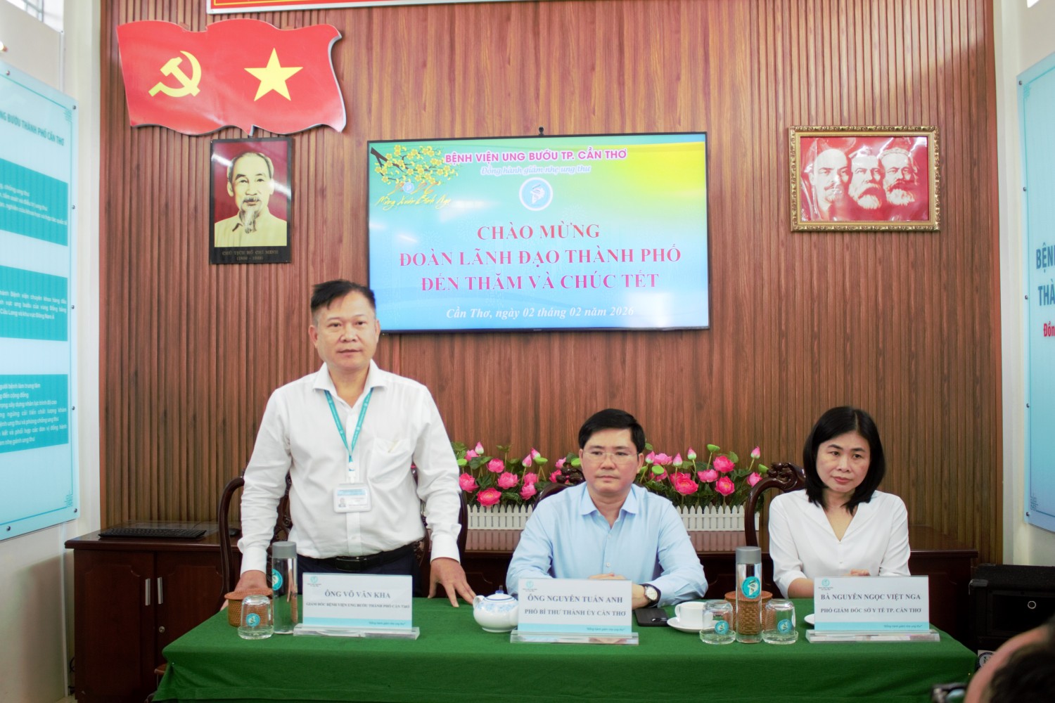 Tại buổi gặp mặt, Ông Nguyễn Tuấn Anh – Phó Bí thư thành ủy Cần Thơ ghi nhận những đóng góp của Bệnh viện trong công tác khám chữa bệnh chuyên sâu, chia sẻ áp lực và đặc thù điều trị ung thư, đồng thời gửi lời chúc năm mới sức khỏe, đoàn kết và hoàn thành tốt nhiệm vụ chăm sóc sức khỏe nhân dân.