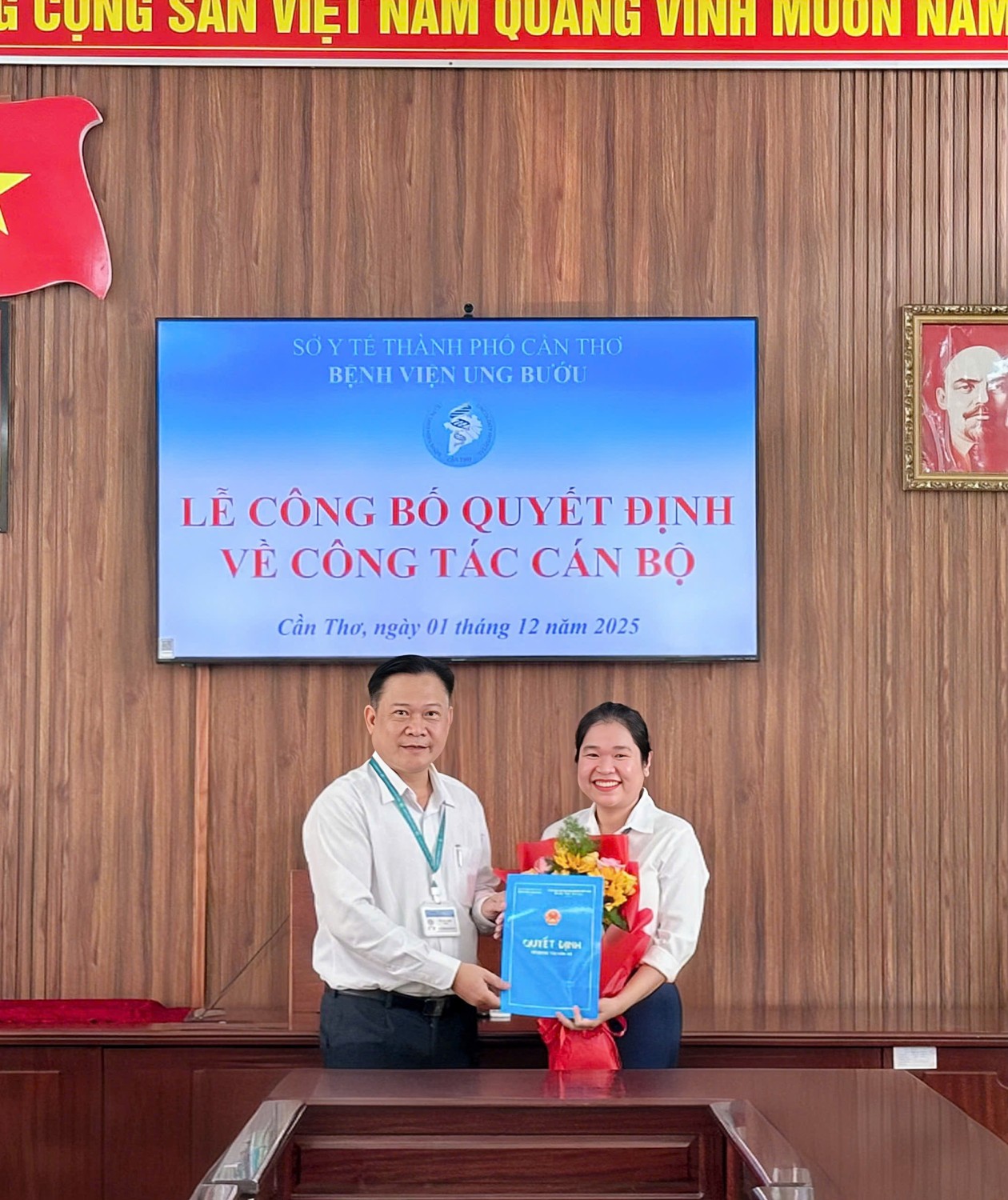 Chiều ngày 01 tháng 12 năm 2025, Bệnh viện Ung bướu thành phố Cần Thơ đã tổ chức Lễ công bố trao Quyết định bổ nhiệm Kế toán trưởng Bệnh viện trong Bệnh viện. Tham gia buổi Lễ trao Quyết định bổ nhiệm có TSBS. Võ Văn Kha - Bí thư Đảng ủy - Giám đốc Bệnh viện, BSCKII. Huỳnh Thảo Luật - Phó Giám đốc - Chủ tịch Công đoàn Bệnh viện, BSCKII. Lê Tiến Mãnh - Phó Giám đốc Bệnh viện, TS.BS Hồ Long Hiển - Phó Giám đốc Bệnh viện cùng các trưởng, phó khoa, phòng trong Bệnh viện.